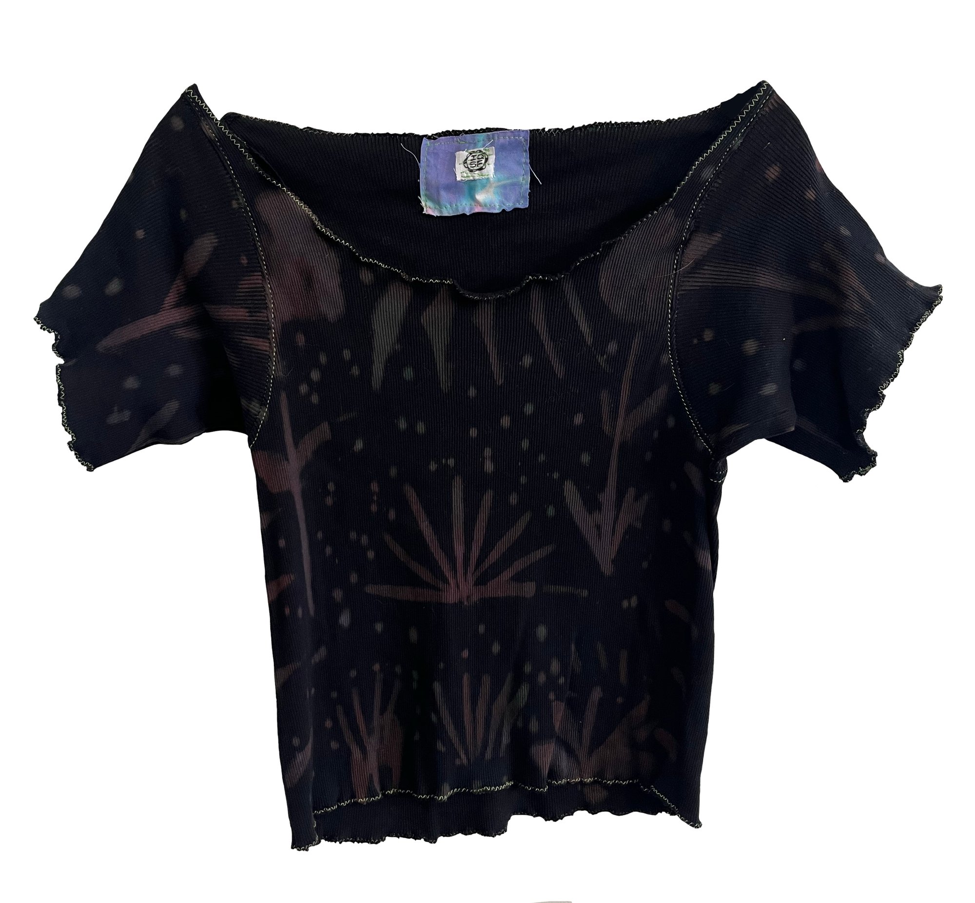 Ribbed cotton constructed tee with bleach drawings and scalloped seams